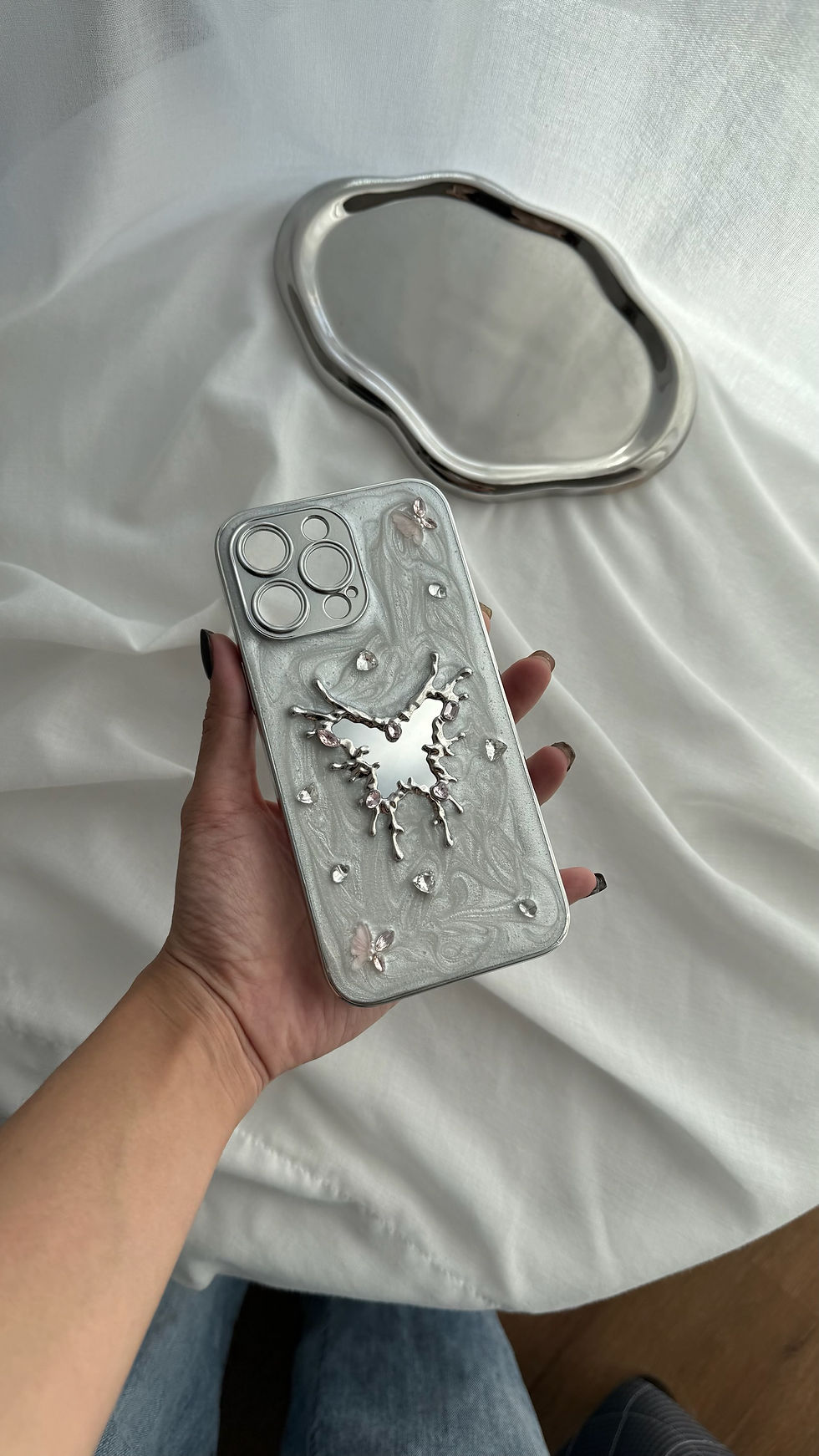 Aesthetic Cute White Silver Luxury Case for 3D Hearts Metallic Minimal Vegan